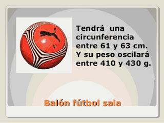 Balón: Será esférico con una superficie exterior de cuero, goma o material sintético. Tendrá una circunferencia entre 61 y 63 cm y su peso oscilará entre 410 y 430 gramos.